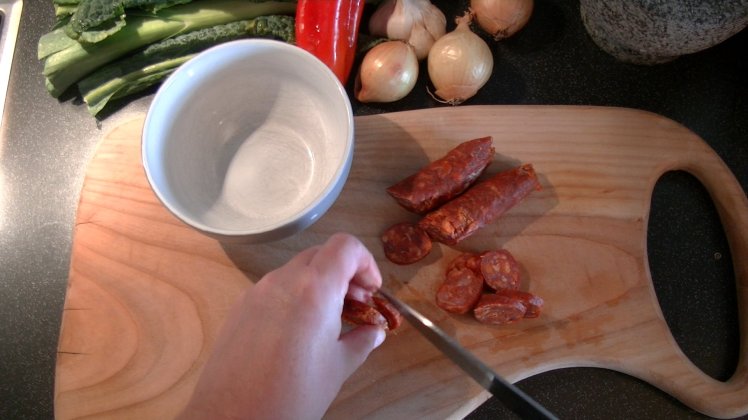In der Zwischenzeit wird die Chorizo-Wurst von der Haut befreit und in