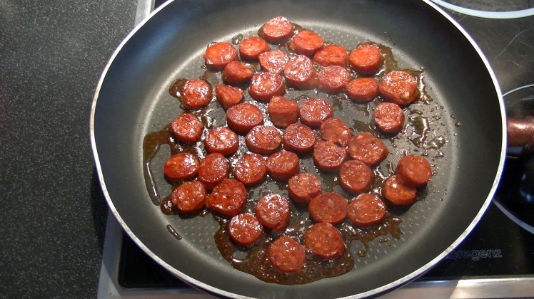 Etwas Olivenöl in der Pfanne erhitzen und als Erstes die Chorizo Stücke beidseitig schön knusprig Anbraten.