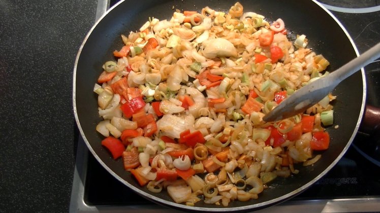 Nun geht es schon ans Anbraten in der Pfanne. Es sollte eine möglichst große Pfanne gewählt werden weil jetzt nach und nach alle Zutaten darin angebraten werden.