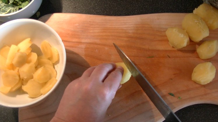 Als letztes werden die vorgekochten Kartoffeln geschält und in Scheiben geschnitten.