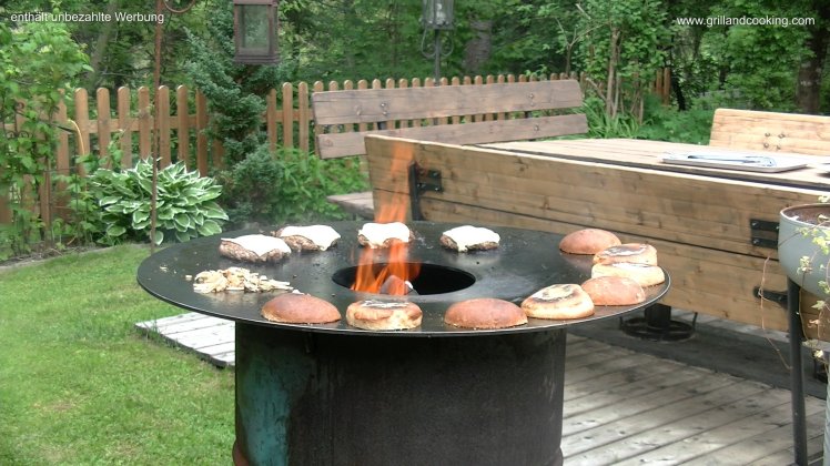 Eine Feuertonne mit Grillplatte(Ring) eignet sich hervorragend um komplette Burger-Kreationen darauf zu machen.