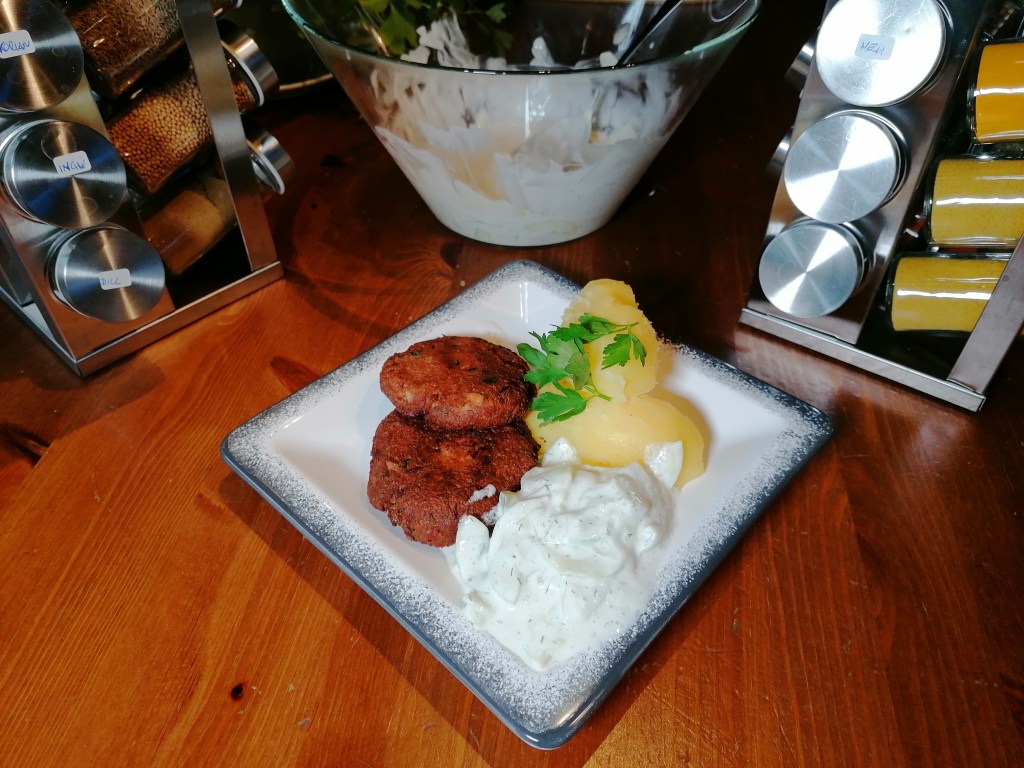 Zu meiner Variante habe ich als Beilage, Kartoffeln und einen Gurken-Rahmsalat gemacht.