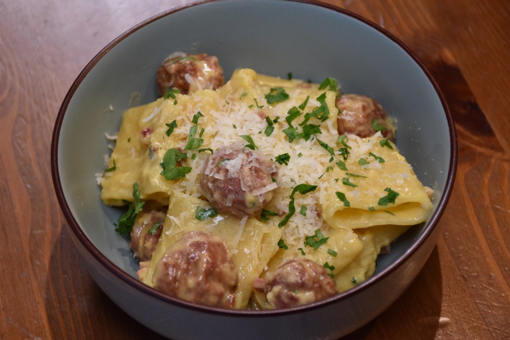 Bei kleinster Stufe nun die Nudeln auf eine Kochplatte stellen und die Carbonara sowie die gebratenen Salsiccia Kugeln und Speckwürfeln unterrühren.