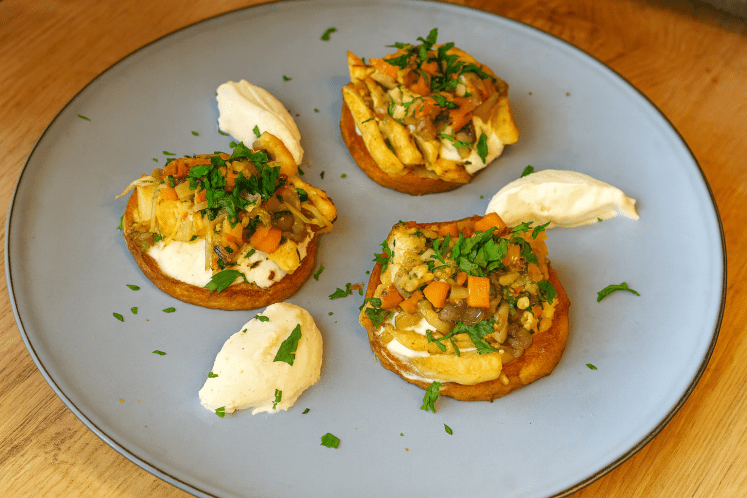 Manchmal braucht es nicht viel, um ein Gericht zu zaubern, das alle Sinne begeistert. Unsere Golden Bites – herzhafte Süßkartoffel-Taler mit Huhn & Dip verbinden knusprig gebratene Süßkartoffeln mit zarten Hühnerstreifen, frischem Gemüse und einem cremigen Frischkäsedip. Verfeinert mit Kräutern, einem Hauch Ahornsirup und frischer Petersilie entsteht ein Rezept, das nicht nur satt macht, sondern richtig glücklich!